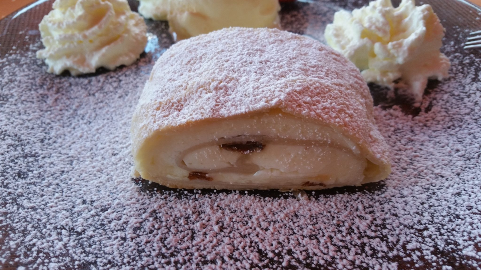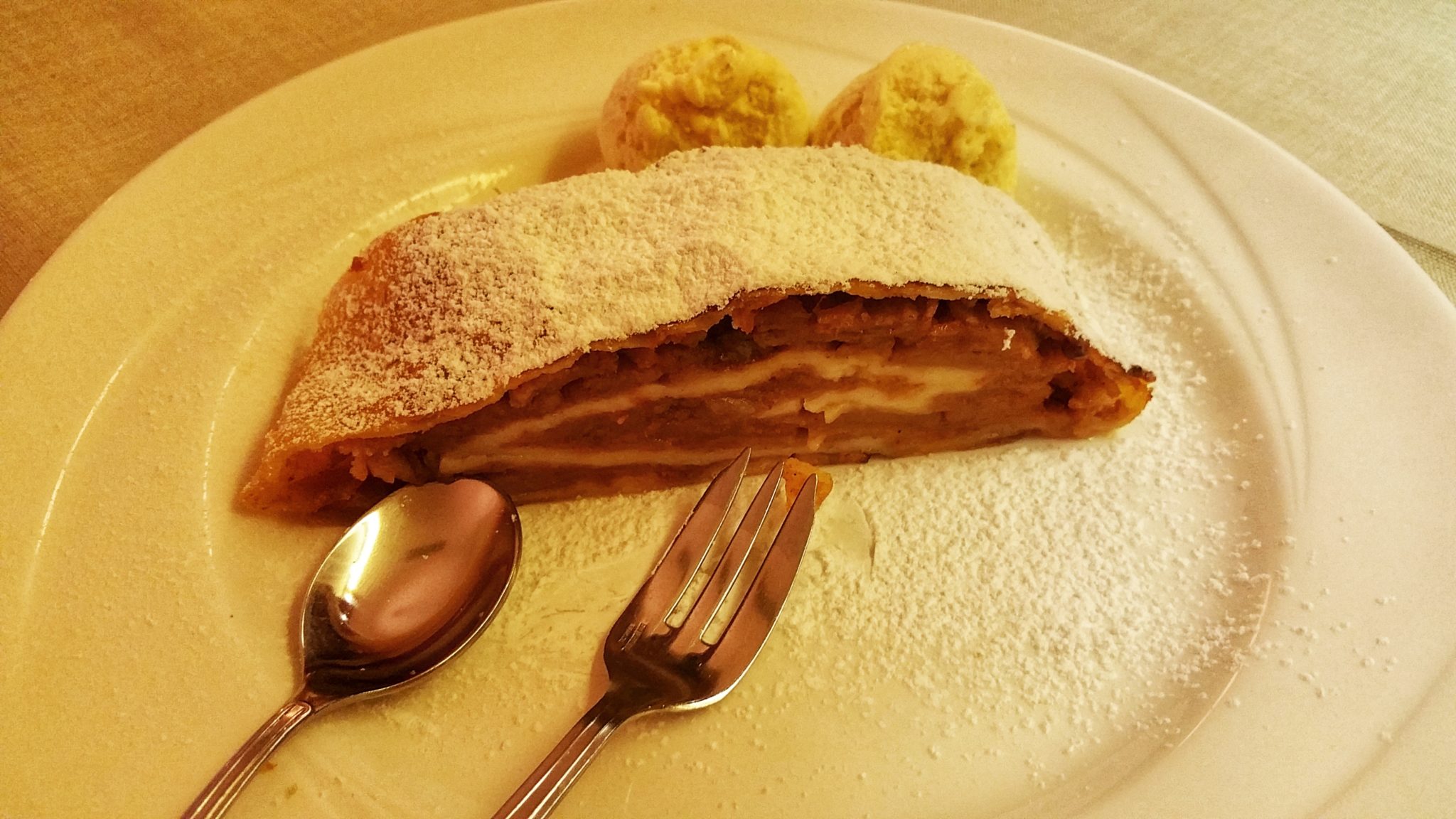 Desserts included apple strudel or topfenstrudel (cream cheese strudel), accompanied by vanilla ice cream.