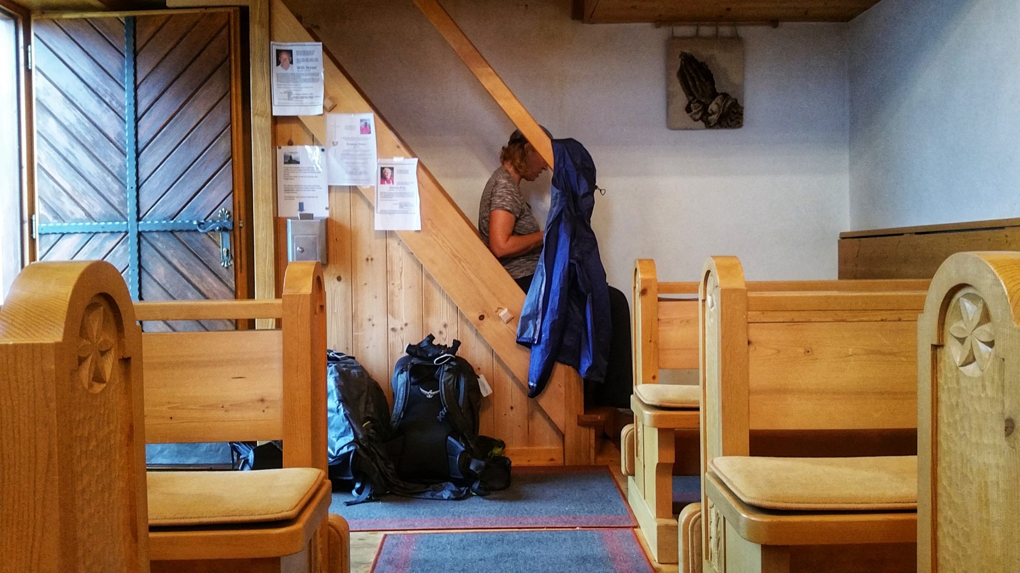 He soon returned, having found a small open chapel that was located about two blocks away. Even though it was still pouring, we walked quickly down the road. It felt great to enter the warm room, comprised of just a few rows of pews. Once inside, I got my phone out and checked the weather forecast. It called for another hour of rain, then clear skies for the rest of the day. So we waited while the thunder boomed and flashes of lightning lit up the sky just outside of the door.